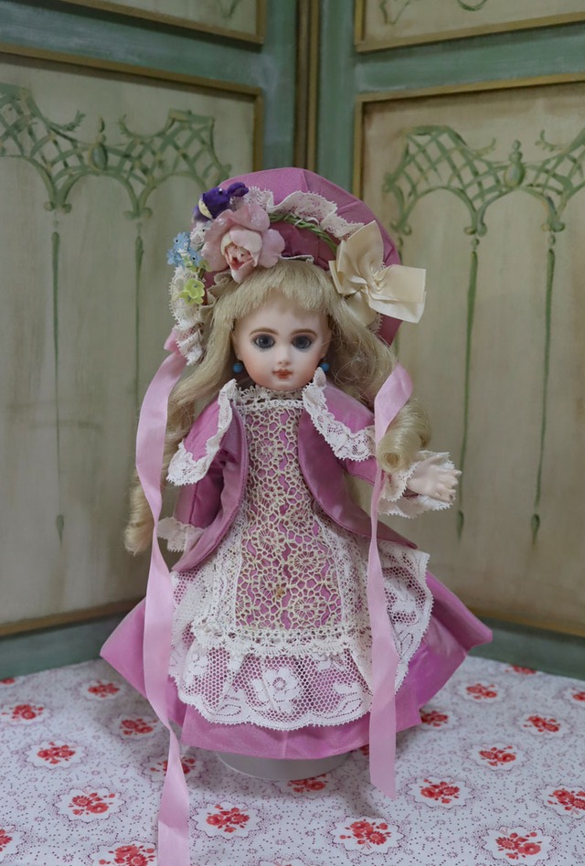 画像7.8枚目は身長約25cmのアンティークドールに着用、その他の画像ははリプロドール身長約27cmに着用させています。 アンティークレースと優しいラベンダーピンク色のシルク生地でクラシックな形のジャケット風のドレスとボネットのセットを製作しました。 ボネットはドレスと共布で、製作しました。リボンで結べるようにシルクリボンをおつけしています。 結んでも後ろに垂らしても良いと思います。 スカートの後ろがふんわりと膨らんだシルエットです。 細かなレースを飾り小さいながら凝ったドレスになりました。 ウェストがタイトに着せられて美しいシルエットです。 アンティークジュモー1号のヌードサイズ ジュモー1号 身長 25/脇下 バスト14/ウエスト15/ヒップ17/首回り9/二の腕回り 5.4/手の平回り 4/ 肩幅(外) 6/肩幅(内)5/腕付け根から手首まで 7/腕付け根からウエストまで /ウエストから膝まで 7/ウエストからくるぶしまで 10/着丈 13.5/ヘッド周り 17 後ろ首付け根中央からかかとまで18cm リプロジュモードール1号 ヌードサイズ :身長約27/肩幅 4.5(腕外側まで計ると6.5)/首まわり 8.5/二の腕 5/脇下バスト 15/ウェスト 14.5/ヒップ 16/肩から手首 8cm/頭回りウィッグをつけて17cm 後ろ首付け根中央からかかとまで20cm ドレスサイズ 肩幅約7.7/ワンピース着丈約18/バストあたりの回り約18cm ジャケット袖丈約7.2cm