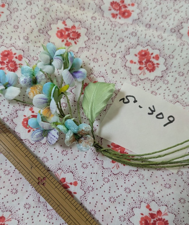 カワセミ色の花びらが美しい すみれのブーケです。 画像の数字表示のものの現品です。 それぞれの花に個性があり小さなすみれが存在感あります。 素材はビロードや毛足のあるシールという生地で製作しています。 年数が経っていくうちに 馴染んだ色合いに変化していきましてもとても雰囲気のあるものになる、手染めの布花はアンティークにも似合い、ドールや小物飾りとしてもお気に入りになるでしょう。 お花が7本、葉が一本のものを軽くまとめています。 リボンを飾ったり 英字新聞に乗せてディスプレイしたりも素敵です。 ドールのお持たせにもおすすめです。