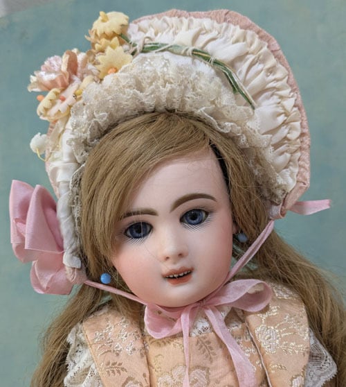 アンティークにも似合う落ち着いたローズピンク色のシルク生地ボネットです。